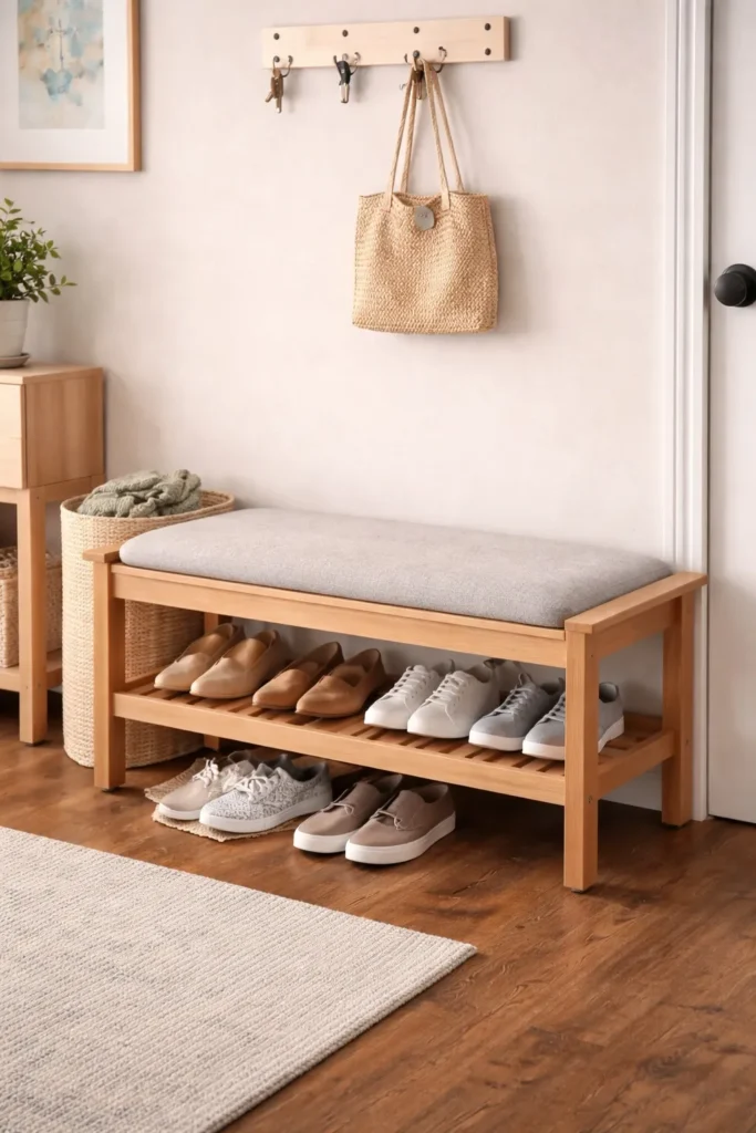 Effective shoe storage keeps pairs contained and prevents them from spreading across the entryway floor. In small spaces, the goal is to stay organized while maintaining a clear walking path.