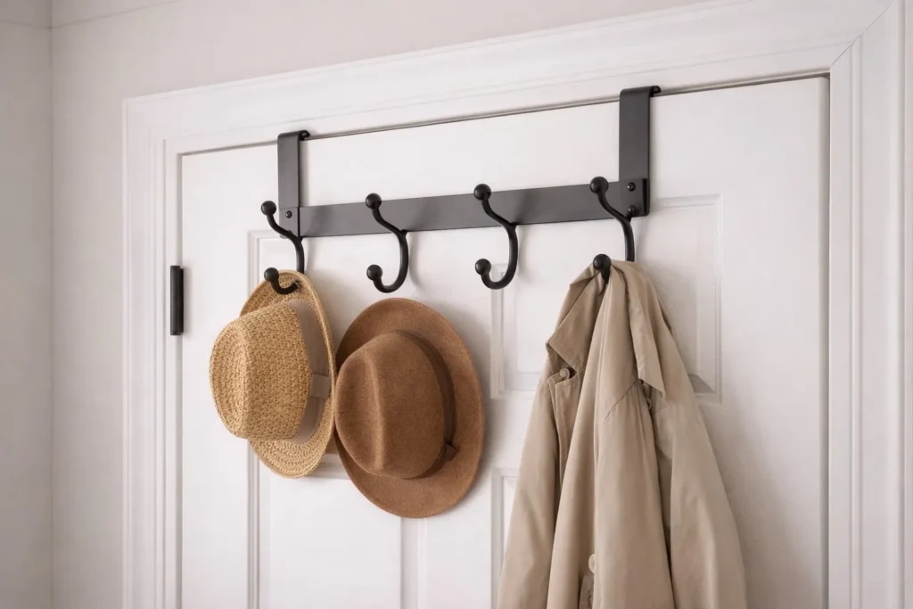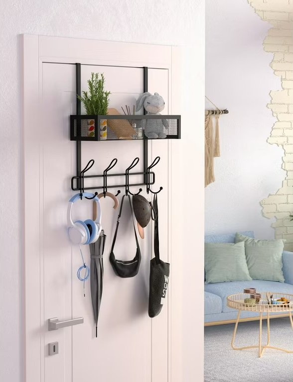 Over-the-door hooks make use of often-overlooked space, adding storage without taking up any floor area. They’re especially helpful in small entryways where traditional coat racks won’t fit.