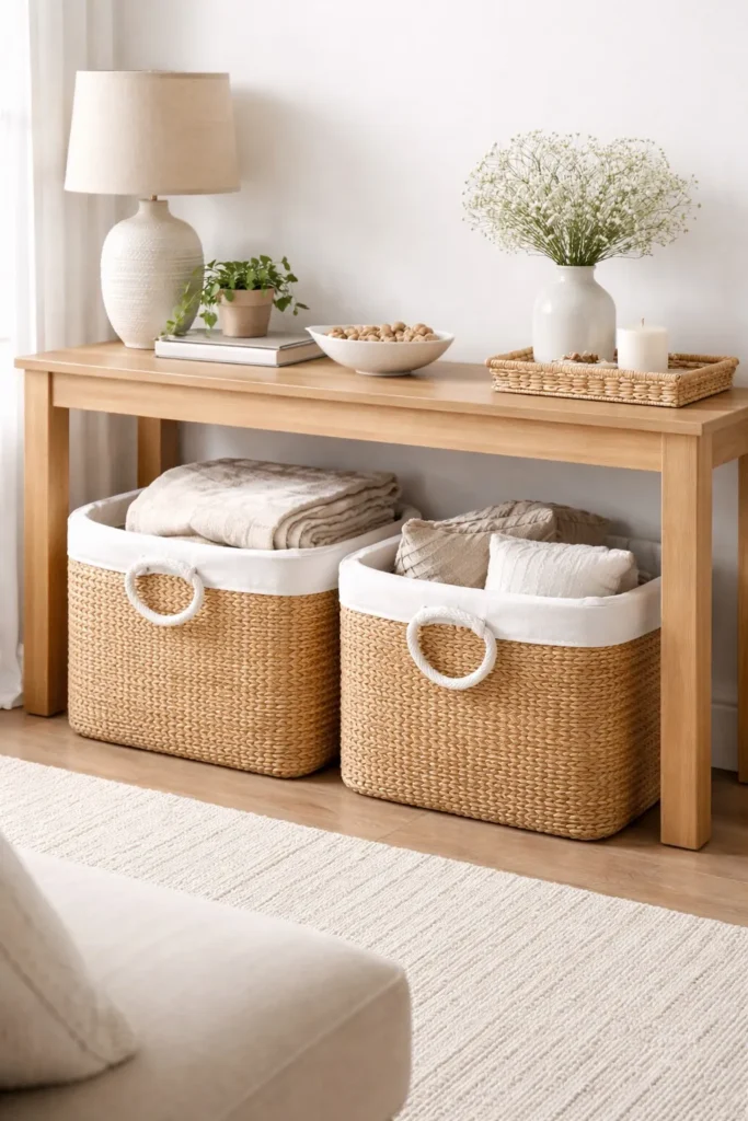 Storage baskets help contain everyday items like scarves, bags, or accessories, keeping them from turning into clutter.
