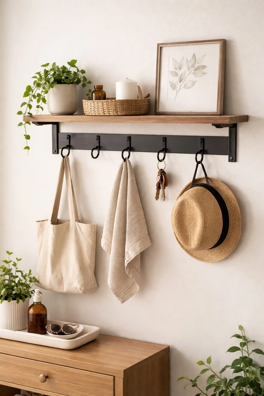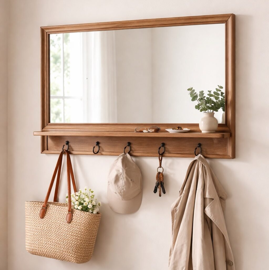 Keeps coats, keys, and small items organized without taking up space.