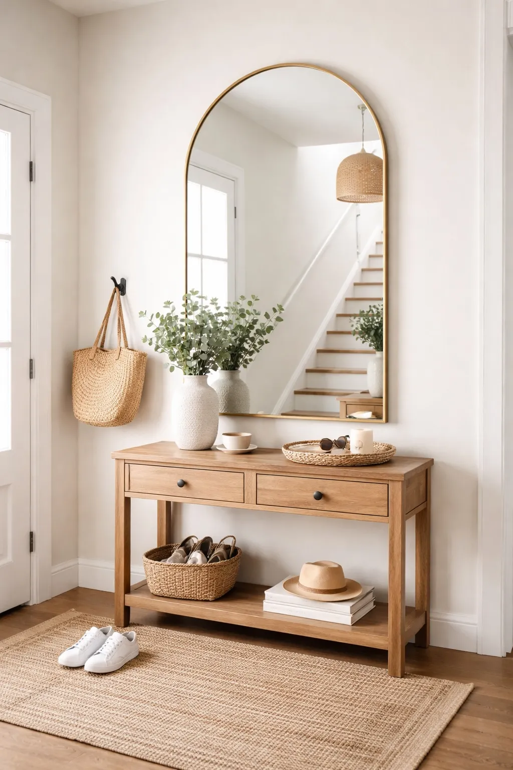 A mirror can make a small entryway feel larger by reflecting light and opening up the space. It also provides a convenient spot for a quick check before heading out.