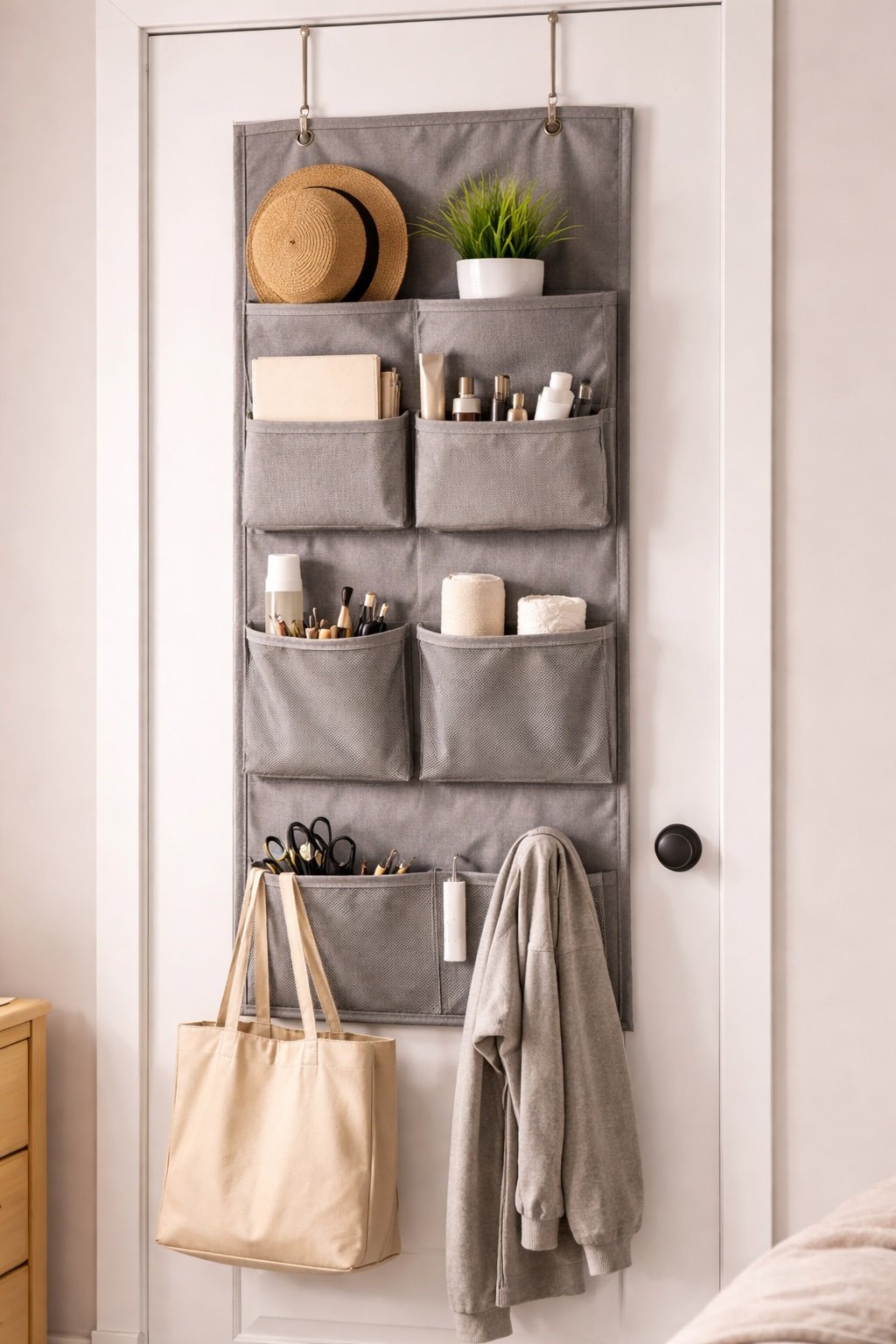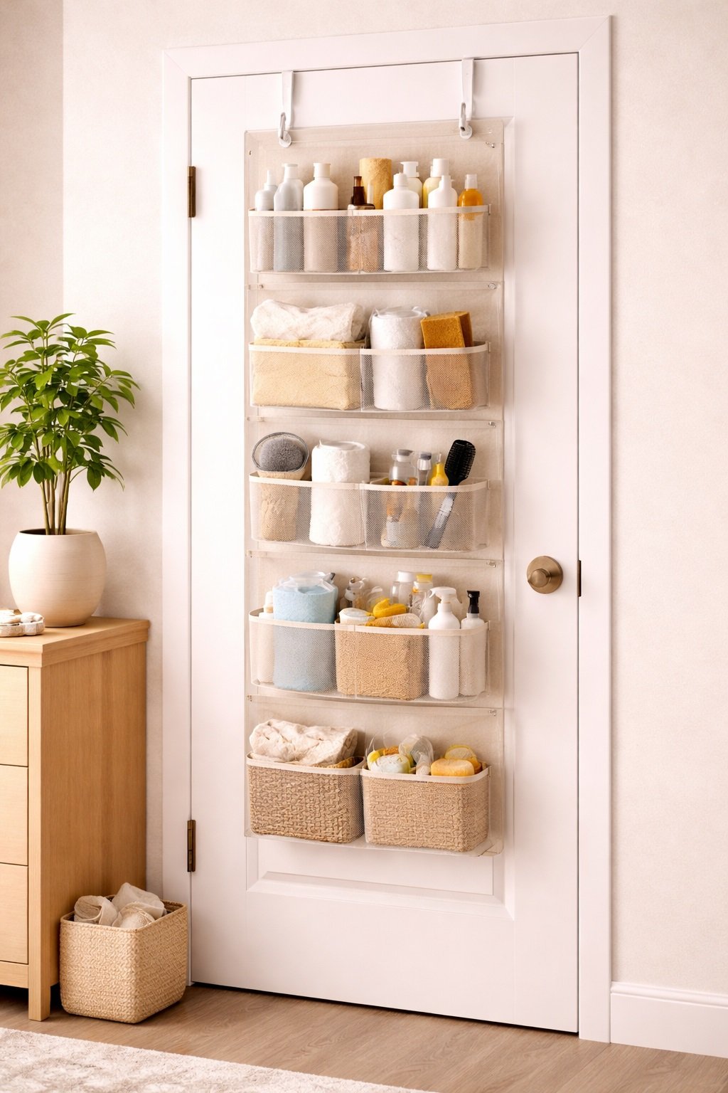 Over-the-door organizers add vertical storage without taking up floor or shelf space, helping keep items in one place.