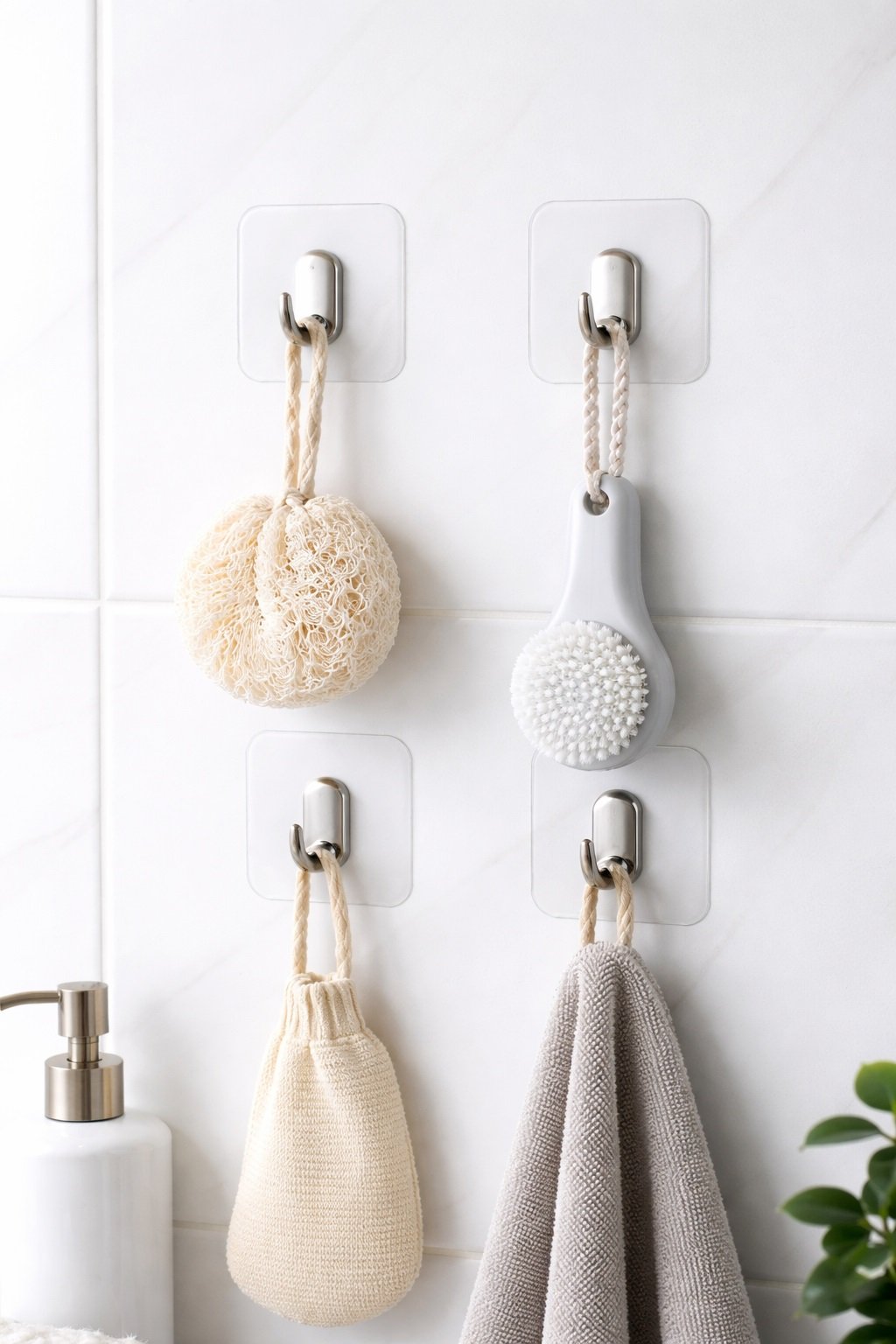 Adhesive hooks turn unused walls, cabinets, and doors into storage, keeping frequently used items visible and easy to grab.