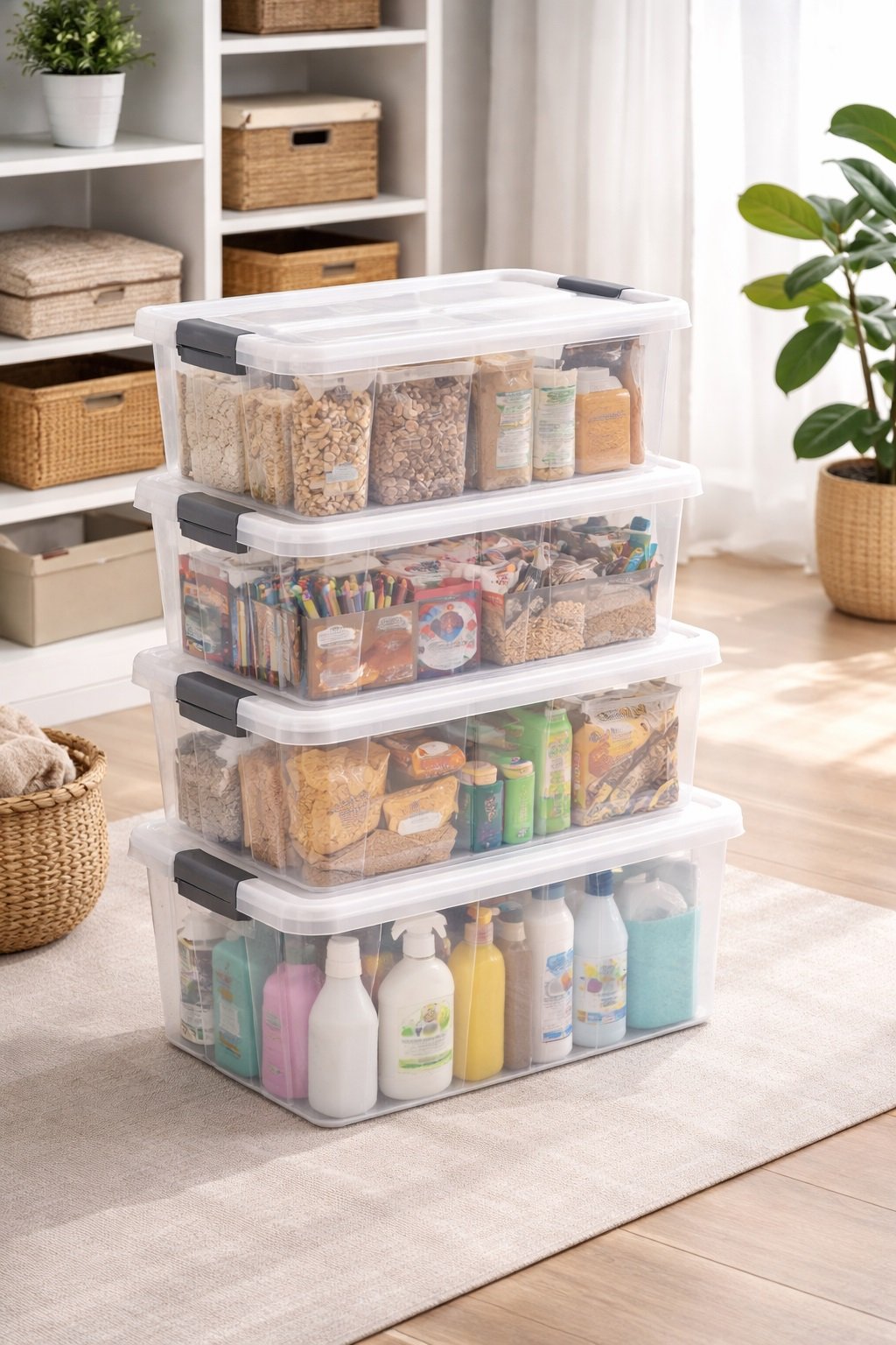 Durable bins with lids that allow secure stacking while keeping items protected and organized.