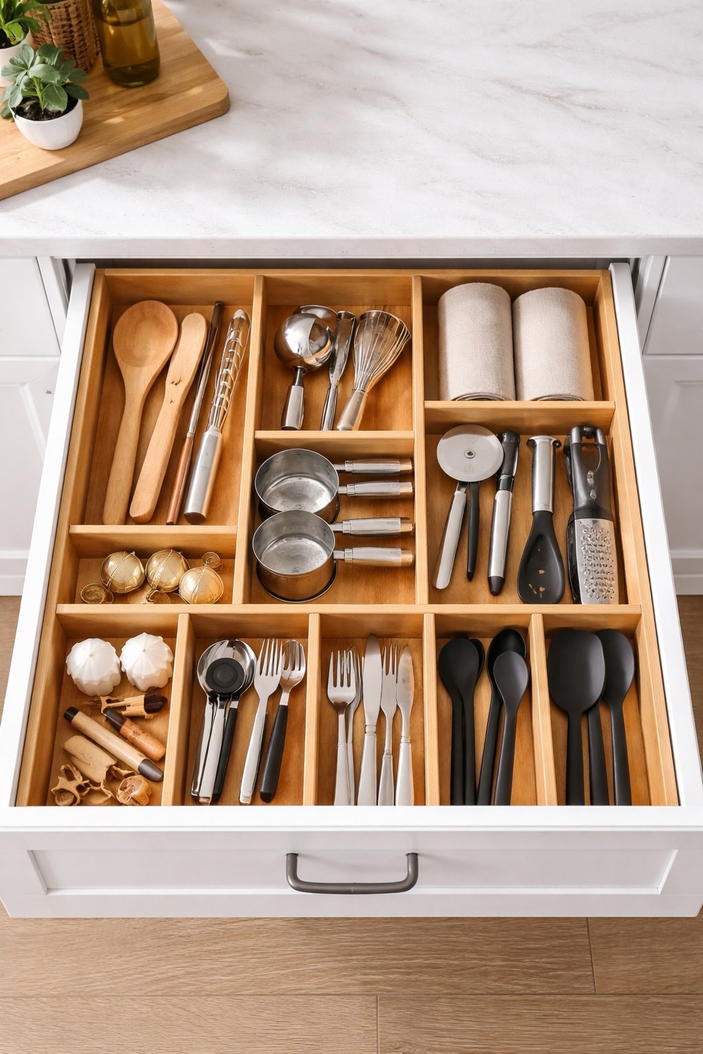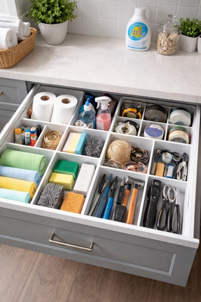 To keep drawers organized, group similar items in each section so everything has a consistent place.