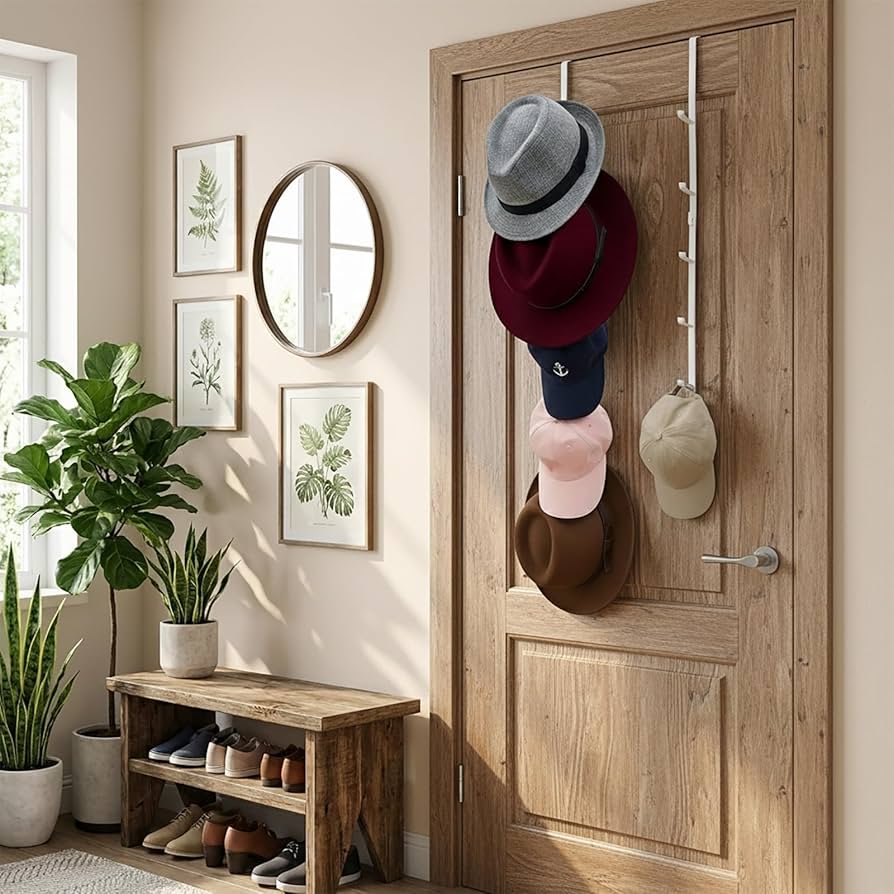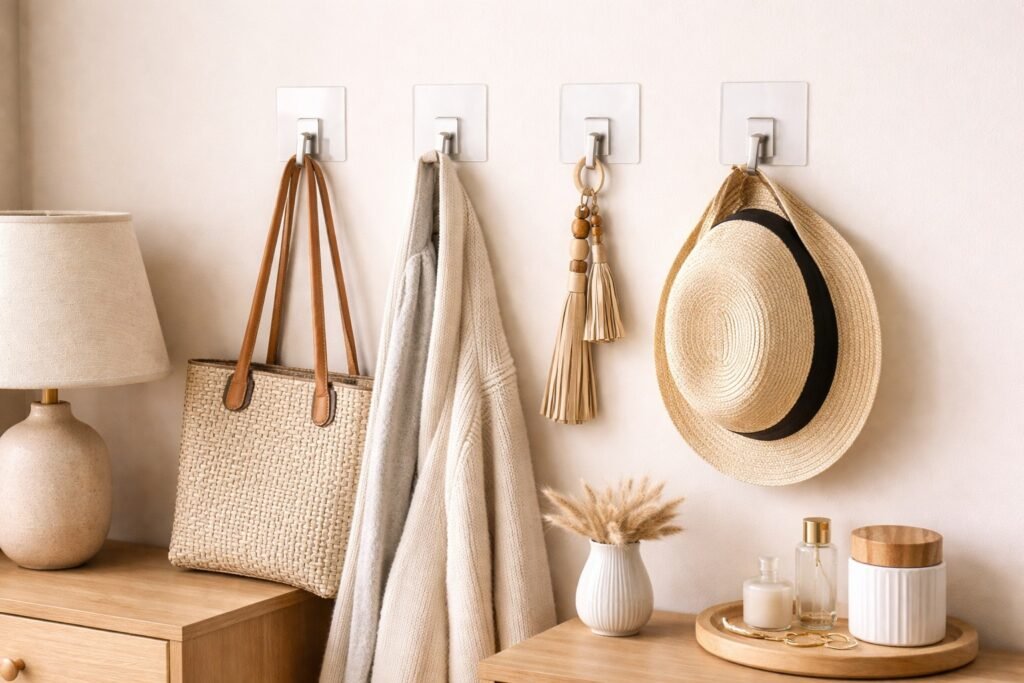 Door hooks add instant hanging storage without installation, keeping items off surfaces and within reach.