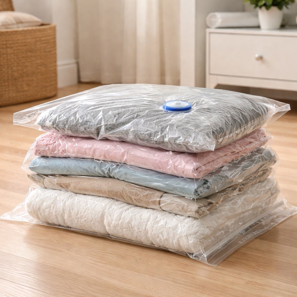 Compresses bulky items like bedding or seasonal clothing to significantly reduce storage space.
