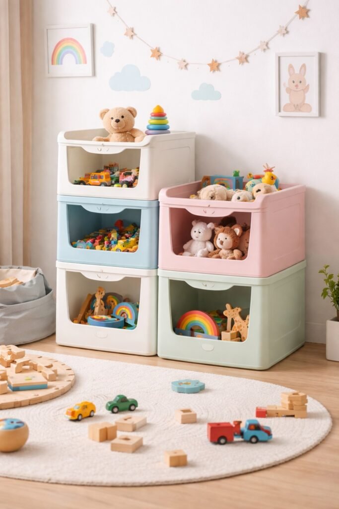 Stackable containers let you build upward, keeping items organized within the same footprint.